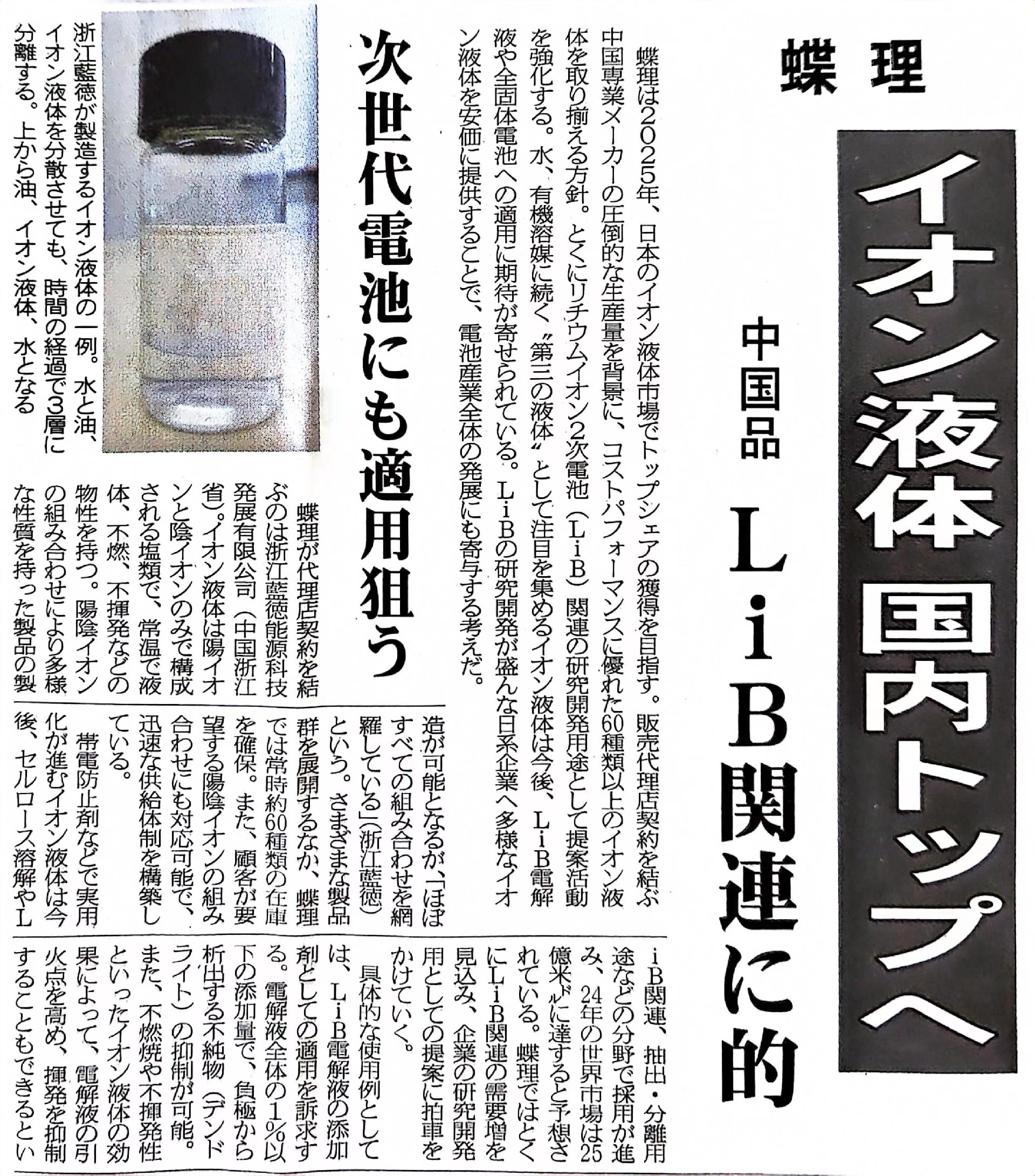 In de Japanese Chemical Industry Daily van 10 juli 2023 trok de relevante inhoud van Zhejiang Ldet Energy Technology Development Co., Ltd. (hierna "Ldet Technology" genoemd) brede aandacht. Dit rapport getiteld "Toepassing van ionische vloeistoffen in nieuwe energiebatterij-elektrolyten" beschrijft de belangrijke onderzoeksresultaten van Ldet-technologie op het gebied van nieuwe energietechnologie.